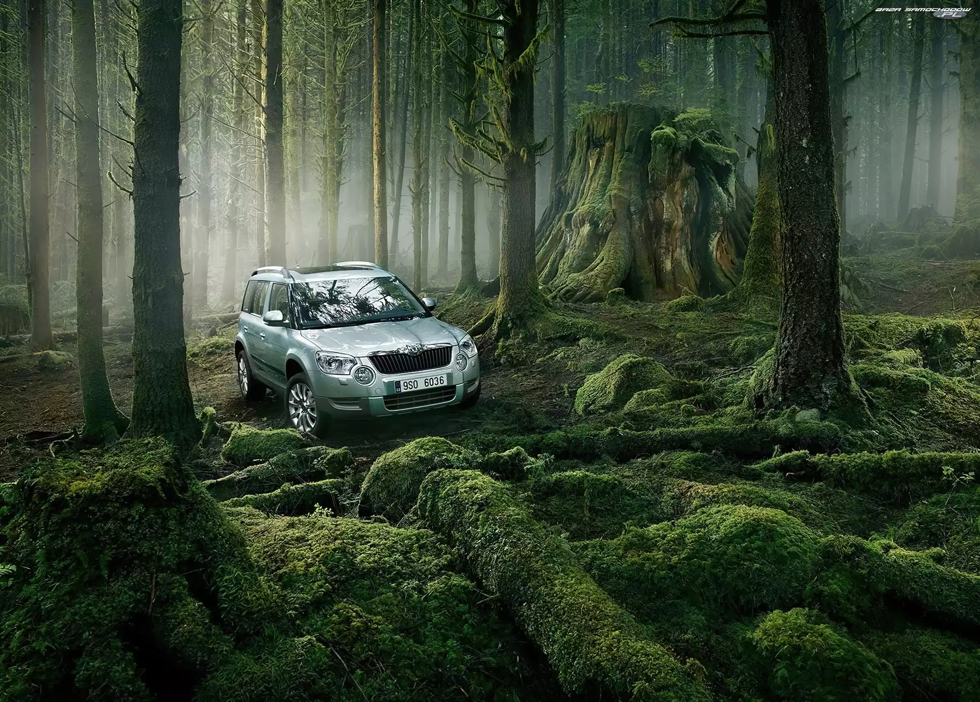 Samochód: Terenowa, Skoda, Pnie, Las